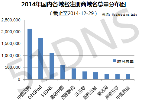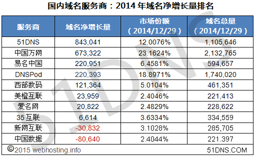2014年,中国万网以213万个域名占据国内市场主导地位。但从年度净域名增长统计来看,却被ynysys击败,排名第二。此外,易名中国保持年度净增长第三位。下面请看2014年各域名提供商域名的详细增长情况。