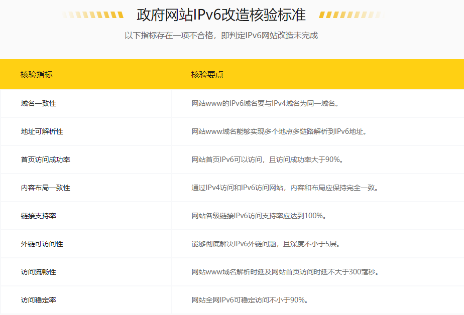 其中,对政府网站IPv6改造的验证更为严格。如果下列检查指标之一不合格,则判定IPv6网站改造尚未完成。