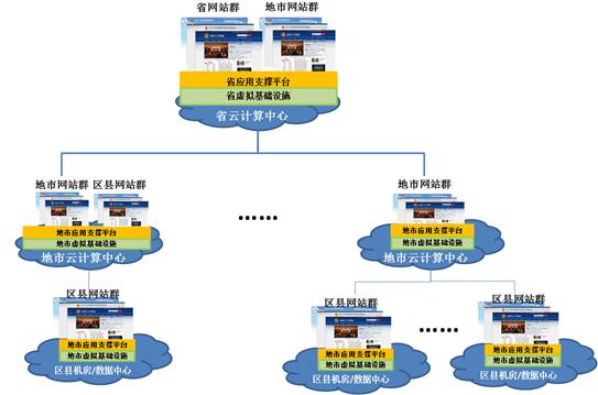 地方政府的应用支撑平台集约化可分为省级、地市级和区县级三级集约方式。省级政府网站应用支撑平台集约化可基于省云计算中心进行建设,省级政府网站群、地市级政府网站群均在此平台上进行建设、维护和运营。地市级平台和县级平台以此类推。在做地方集约化平台时,应满足上级对下级平台的日常监管需要。