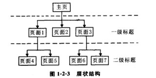 分层结构类似于目录系统的树结构,如图1-2-3所示。它从网站文件的首页开始,分为一级标题、二级标题等,逐步细化,直至提供初始浏览者的具体信息。