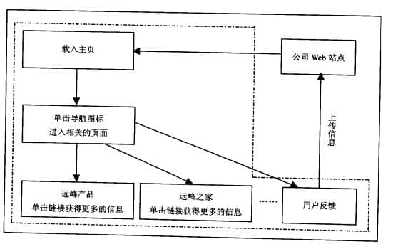 第二类是子级内容(文件内容),包括各个下级网页的内容,如产品信息、部门信息、工作手册和演示文件,甚至数据库。产品信息页内容:公司产品的详细信息,包括鞋型、图片、价格等。 部门信息页内容:提供公司各部门的信息,包括部门职责、负责人、联系电话等。用户反馈页面内容:提供一个表格供用户直接填写信息,包括反馈的内容,用户或访问者的联系方式等。完成网站内容分类后,如下工作是组织各个页面的层级关系和逻辑关系,通常使用表格来完成这项工作,用户或访问者的联系方式。首先从用户或访问者的角度考虑,设计一个访问Web的任务图,如图2.1所示。它的目标是让访问者更容易找到他们想要的信息。