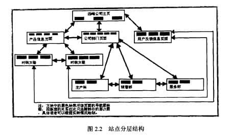 网页的层次关系和逻辑关系是网站结构的重点。合理、有层次地安排每个网页的主题,并在它们之间建立良好的逻辑关系,可以很容易地引导用户访问他们感兴趣的信息。一般来说,网站的层次不宜太深,3层左右为宜足够,让用户通过不超过3次点击就可以到达网站的任何地方,也就是通常所说的网站的三级结构。如图2.2所示,是本例网站的层次结构示意图。