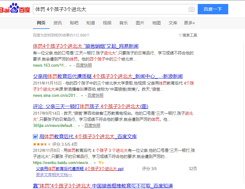 我们在百度搜索框中输入“体罚4儿3入北大”,得到如下信息