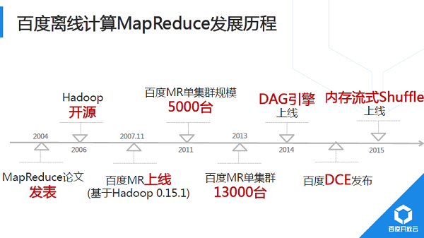 2014年,百度对Shuffle进行重大重构,初期实习生同学完成的Demo以BaiduSort名义参与了2014年Sort BenchMark大数据排序国际大赛,并获得冠军(2015年百度没再参加,国内其他公司以同样技术通过更大规模集群刷新记录)。2015年,新Shuffle技术完成全面上线。Hadoop默认Shuffle实现为基于磁盘Pull模式,计算过程显式分成Map、Shuffle、Reduce过程;Baidu研发的新Shuffle采用内存流式Push模式,Map端完成部分记录处理后直接从内存中将计算结果推送给下游。