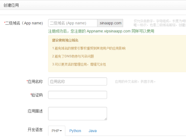 可以看到,我们的应用将被host在sinaapp.com这个域名下,我们能够设置的子域名(App name)显然是全局唯一的,先到先得。除了应用的基本信息外,还需要选择应用使用的编程语言、框架、模板等。PHP语言的框架和模板十分丰富,而Python和Java则没有什么可用的框架或者模板。我们这里使用PHP空应用,创建的的应用名假设为testapp,下面会用到。