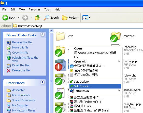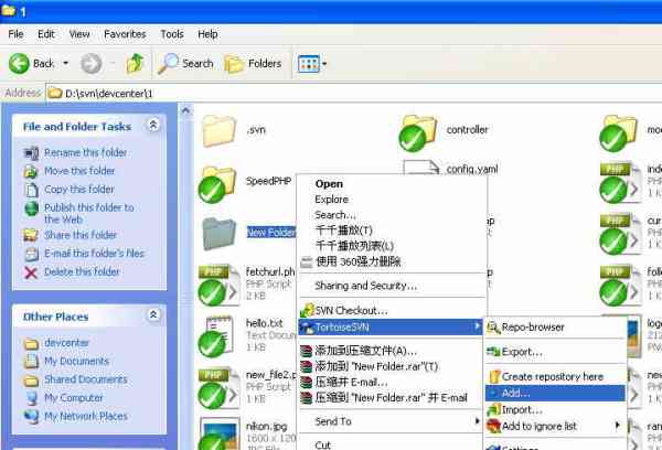 在SVN工作目录下,对于文件修改,完成后只需要commit就ok了,但对于新增文件,或者从其它目录复制进来的文件或文件夹,需要在commit之前需 要做一步add操作,即将文件或文件夹添加到svn工作目录中来,否则SVN客户端不认它。具体操作很简单,如图: