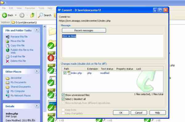 然后填写关于本次更新的日志(log message),这是必填项,否则commit会失败。如图: