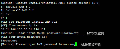 输入1,然后回车,会提示我们的VPS的IP,因为我的VPS有2个IP,也可以看到。然后我们需要输入MYSQL密码。