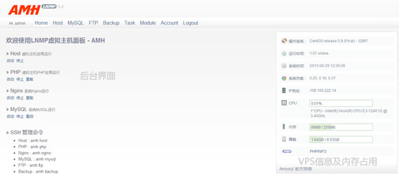 这篇的简单介绍AMH面板就这样,后面我会实战与大家分享使用,安装常规的CMS站点。需要说明一下,开始在安装的时候我用的是一款免费的1G内存方案的VPS,机房速度不是太好,后来我换成目前的一款在洛杉矶的机器,速度好一些。测试机器是256M内存的,不要到时候朋友看到前面的机器IP信息和后面不同,不要认为是虚假的教程,教程是完整的。
