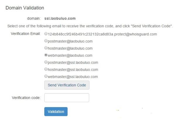 这里我们选择一个可以用的邮箱然后点击Send Verification Code按钮发送邮件,然后收到的激活码输入后点击Validation按钮验证。这里需要注意的,如果我们没有域名邮局,会自动检索WHOIS邮箱,如果我们有隐私保护的,那可以先取消,等接受到后再开启隐私保护。这里我用的是"webmaster@laobuluo.com"域名邮局,所以选择后接受验证。