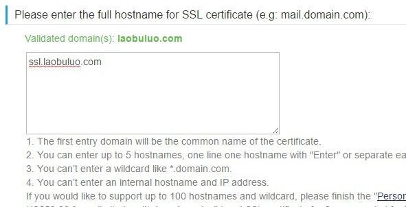 我们可以最多填写包含"laobuluo.com"5个子域名,一行一个,StartSSL免费SSL只能支持5个,如果需要多个,那就需要购买付费服务。