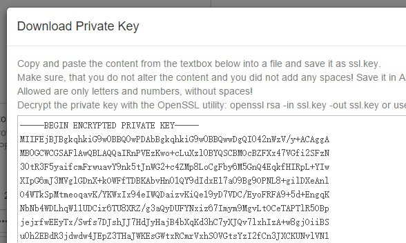 按照StartSSL的文档一步步的来。不过我是直接选择在 https://startssl.com/Certificates 中设置「Certificate Signing Request (CSR)」>「Generated by PKI system」,又因为在线生成证书这一步必须得输入密码,所以导致下面的问题(上传自己在服务器上生成的证书可能不会碰到这个问题):