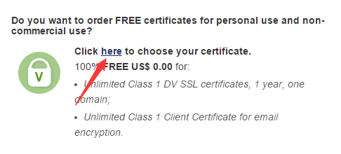 在后台面板中我们可以看到很多付费的SSL证书,具体的有什么特别之处我也不去了解了,这里找到上图所示的位置,看到是免费证书就是我们要找的,点击HERE链接进入下一步看看需要点什么资料才可以申请到。