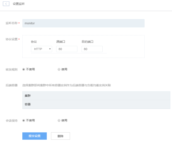 协议设置 每组监听可以配置一组转发端口,转发端口包括源端口和目的端口,目前仅支持 HTTP 和 HTTPS。