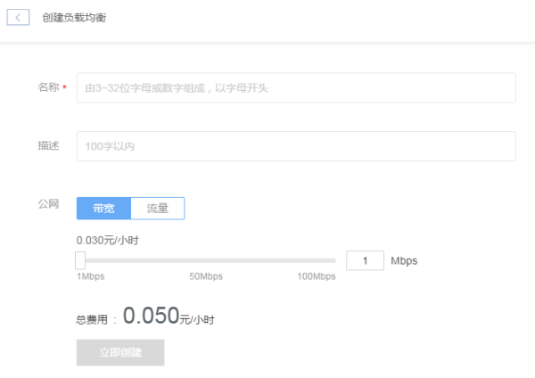 创建负载均衡 点击左侧的导航菜单「负载均衡」,进入负载均衡实例列表页,点击「创建负载均衡」按钮,进入负载均衡创建界面,如下图所示: