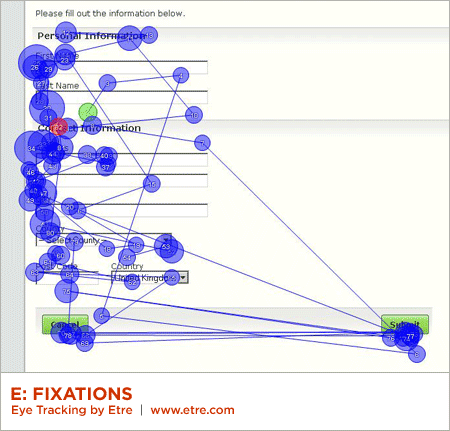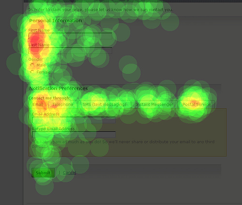 从这张热点图中可以看出,对于表单类别的视觉走向是以左边标签为主向右延展。大部分用户集中在标签位置,通常用户填写顺序也是从上至下的,从左至右,较少用户会选择跳跃式的填写模式。