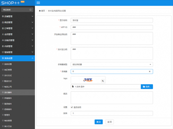 进入商城系统后台,支付宝(电脑网站)设置,如下图所示: