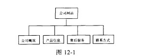 举个例子说明,假设某公司开发了一款软件,想要建立一个网站,让客户更多地了解公司及相关软件,需要一定的售后服务(软件更新程序、下载、在线答疑、等),上级将这个任务交给了我们,我们该怎么办?首先,进行需求分析。按照这家公司的要求,大致定义为商用网络。但由于不需要在线销售等电子商务服务,本网站的模式主要以宣传为主,不进行业务处理。接下来收集相关信息,如公司概况、业绩、产品信息、简单售后服务(及时提供最新升级程序下载、在线答疑、相关新闻发布、客户调查等)、联系方式、等等,最后做出决定分析流程图,由于网站功能比较简单,流程图并不复杂,如图12-1所示。