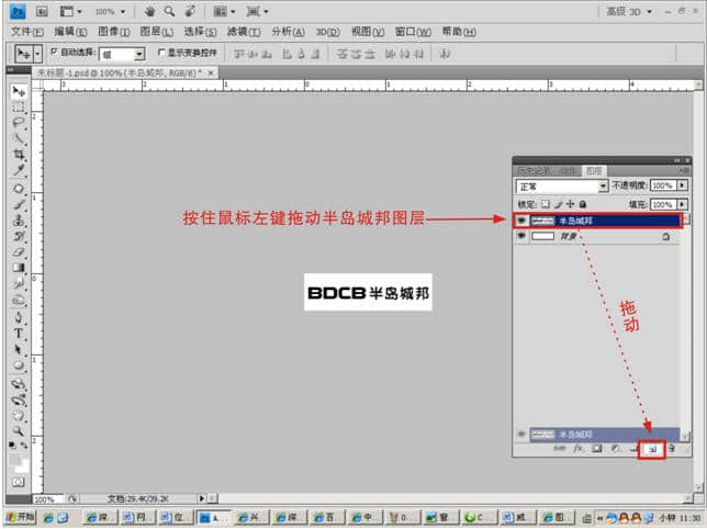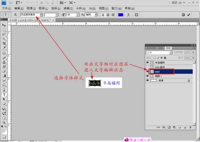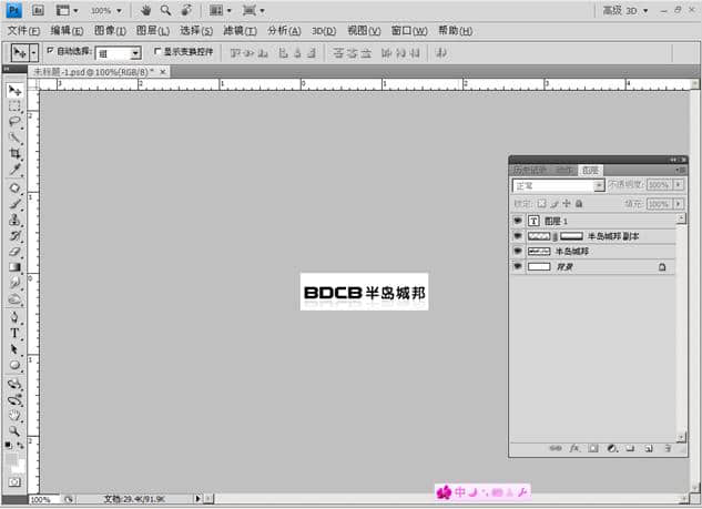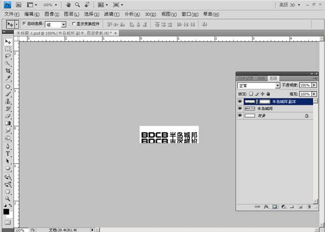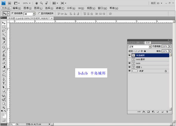 点击工具箱的 文字工具 在窗口空白处输入“BDCB 半岛城邦” (这里以公司名称首字拼音组合为一个LOGO设计模式)