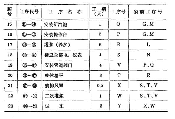 下面列举CPM在某电厂6号锅炉检修中的应用。该厂6号锅炉为国产130T/H液态除渣炉。在这次大修中,除了对标准物品进行大修外,还增加了很多工作量很大的特殊物品。如更换管道系统中的过热器管、更换50%以上的省煤器管、更换和重新安装空预器全部减摩套、更换部分炉底水冷壁管等。重建炉底。相当多的变化项目。据厂内检修人员介绍,上级批准检修期为两个月。面对工程量大、维修人员少、大修周期短的情况,该厂经过认真研究,决定在施工管理中采用关键路线法。对整个大修项目进行了工时定额的预估,并详细、全面地编制了网络图。根据网络图,协调配合施工,全面合理安排项目、人力、物力。紧紧抓住主要矛盾,在重点航线上节省时间,在非关键航线上节省人力物力消耗,从而圆满完成检修任务。在保质保量、降低消耗、缩短工期等方面取得了明显的效果。网络图计算工期比规定值缩短了5天,在实际维护中,施工工期比网络图计算值提前了5天。