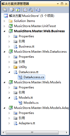 这里不止三个项目了。我加了个UnitTest的项目,一个Adapters的项目,看项目名称不难看出来,UnitTest项目就是一个测试项目。而Adapters项目呢,是实体适配器项目。先不管它们了。